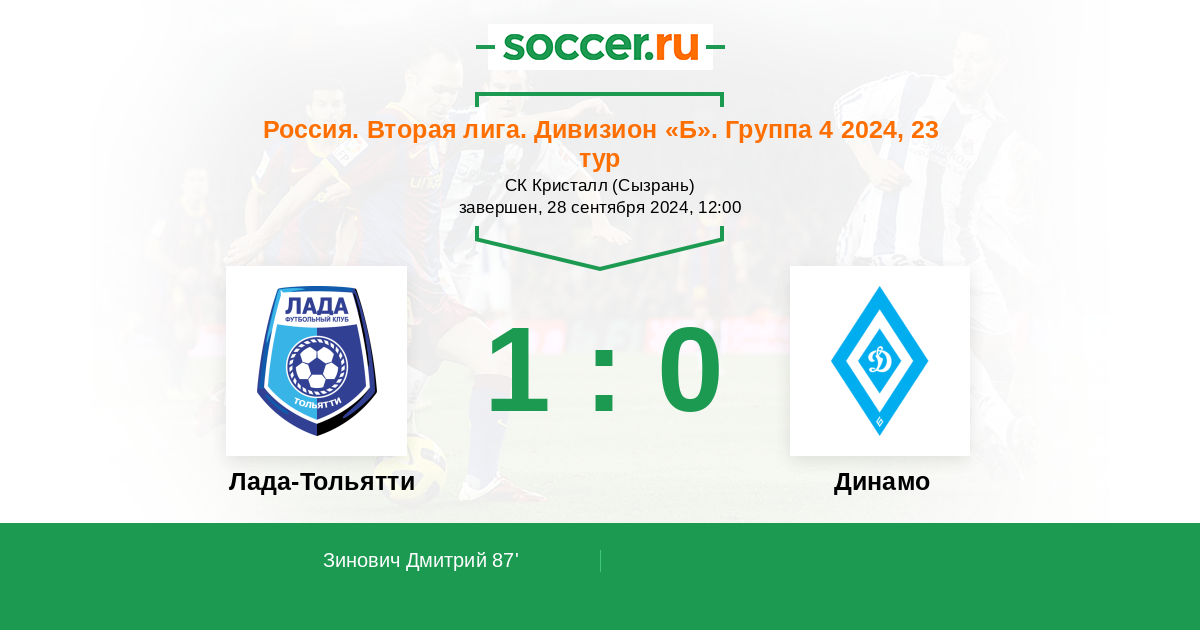 Россия. Вторая лига. Группа 4 30.09.2021 Лада-Тольятти Логотип футбольный клуб Лада-Тольятти 1:0 Логотип футбольный клуб Динамо Барнаул Динамо Барнаул