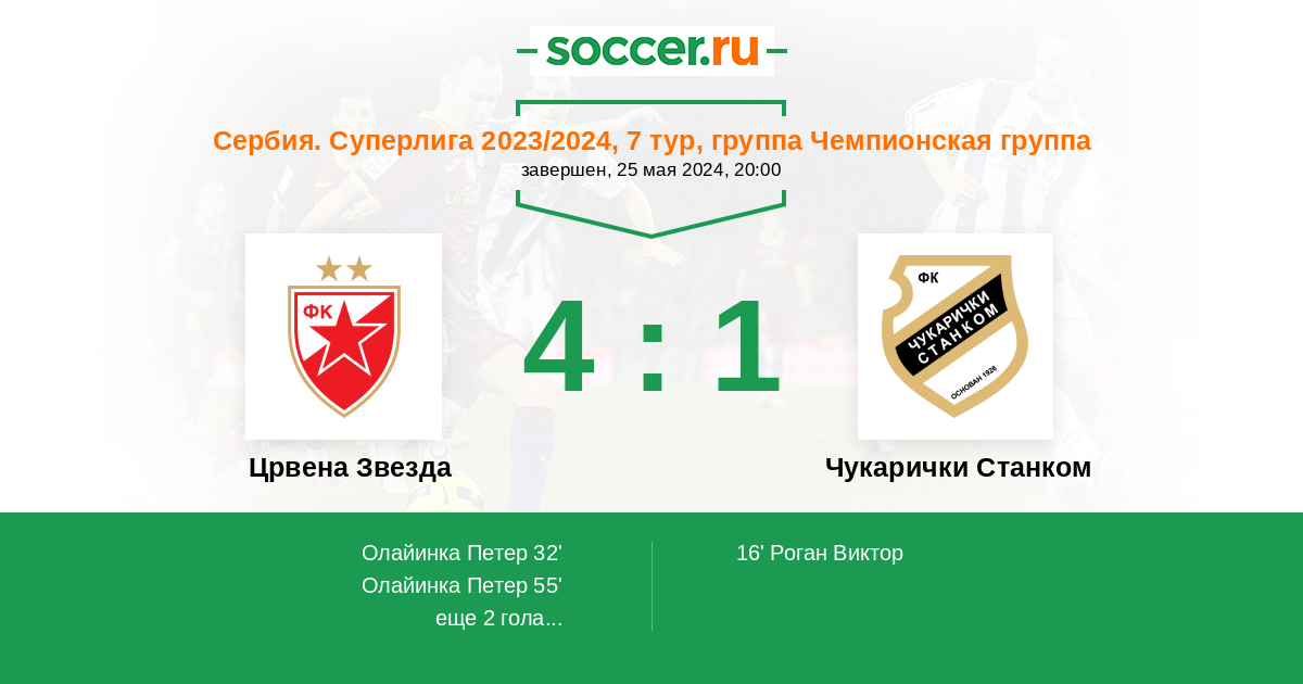 Сербия. Суперлига 30.04.2023 Црвена Звезда Логотип футбольный клуб Црвена Звезда (Белград) 4:0 Логотип футбольный клуб Чукарички Станком (Белград) Чукарички Станком