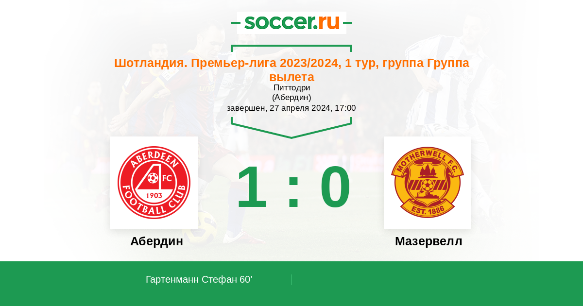 Шотландия. Премьер-Лига 29.03.2025 Абердин Логотип футбольный клуб Абердин 4:1 Логотип футбольный клуб Мазервелл Мазервелл