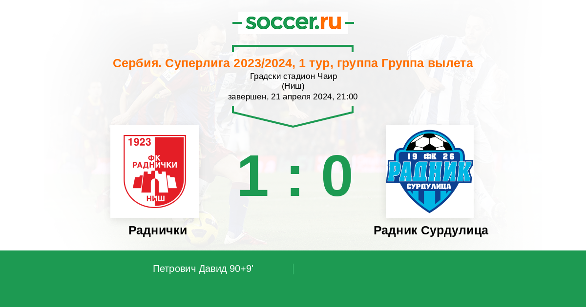 Сербия. Суперлига 27.04.2023 Радник Сурдулица Логотип футбольный клуб Радник Сурдулица 1:0 Логотип футбольный клуб Раднички (Ниш) Раднички