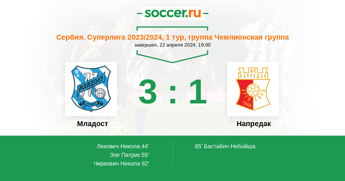 Сербия. Суперлига 04.04.2023 Напредак Логотип футбольный клуб Напредак (Крушевац) 0:0 Логотип футбольный клуб Младост (Лучани) Младост