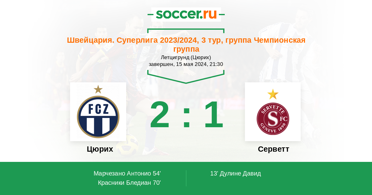Швейцария. Суперлига 06.04.2024 Серветт Логотип футбольный клуб Серветт (Женева) 0:1 Логотип футбольный клуб Цюрих Цюрих