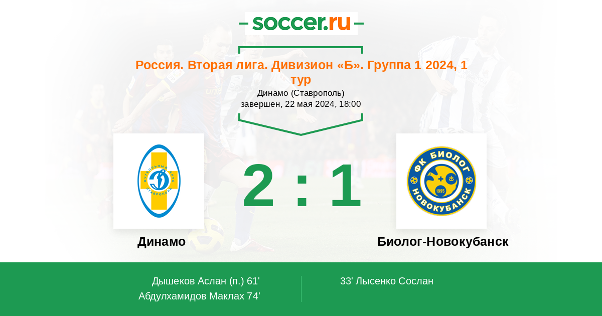 Россия. Вторая лига. Группа 1 10.05.2016 Биолог-Новокубанск Логотип футбольный клуб Биолог-Новокубанск 3:0 Логотип футбольный клуб Динамо Ставрополь Динамо Ставрополь
