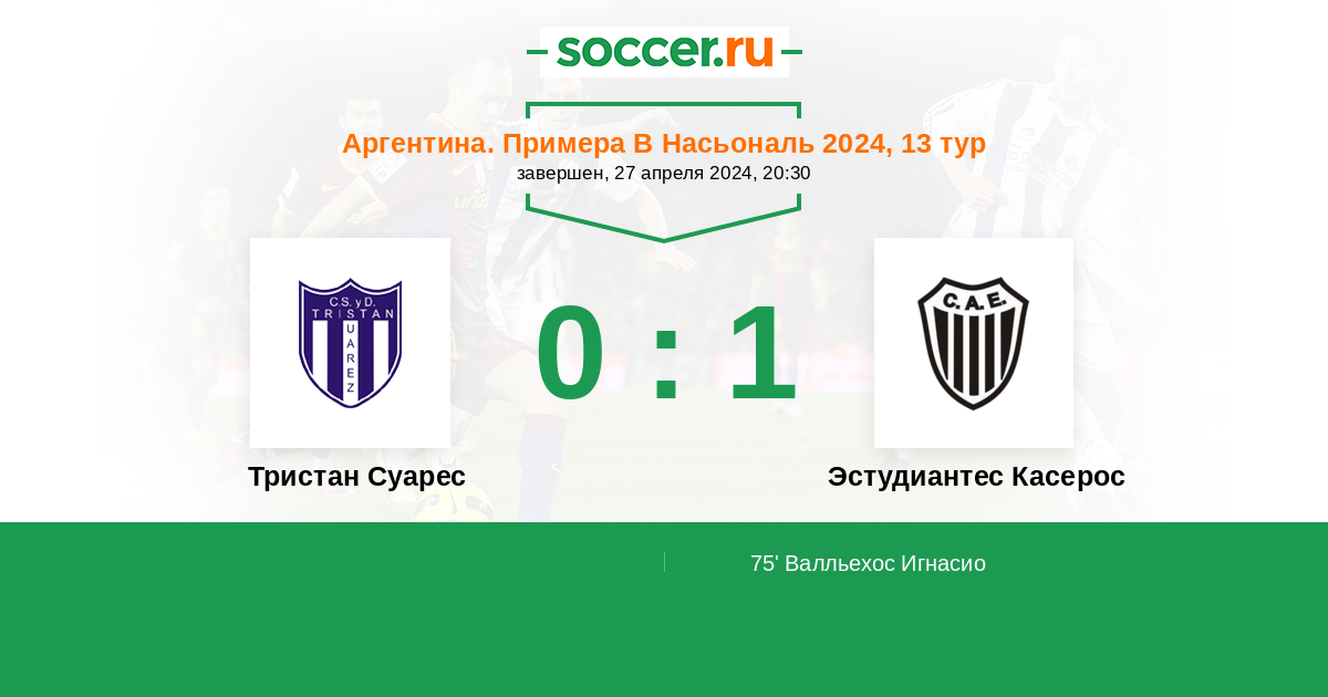 Аргентина. Примера Б Метро 25.03.2018 Эстудиантес Касерос Логотип футбольный клуб Эстудиантес Касерос 1:1 Логотип футбольный клуб Тристан Суарес (Эсейса) Тристан Суарес