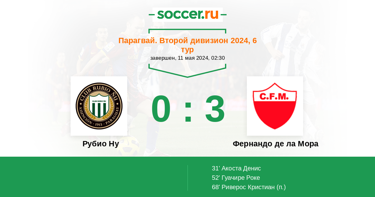 Парагвай. Второй дивизион 13.05.2023 Фернандо де ла Мора Логотип футбольный клуб Фернандо де ла Мора 1:1 Логотип футбольный клуб Рубио Ну (Асунсьон) Рубио Ну