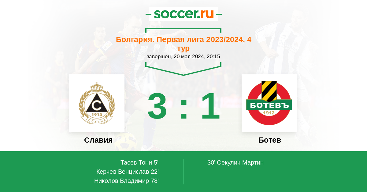Болгария. Первая лига 22.05.2022 Ботев Логотип футбольный клуб Ботев (Пловдив) 2:1 Логотип футбольный клуб Славия (София) Славия