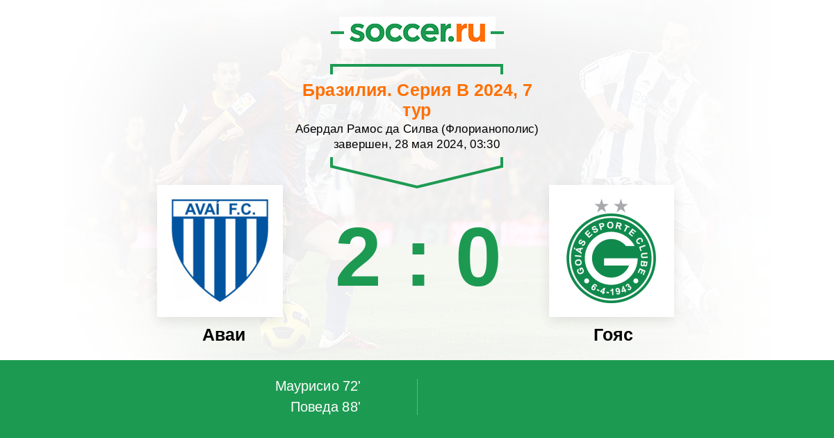 Бразилия. Серия В 05.10.2016 Аваи Логотип футбольный клуб Аваи (Флорианополис) 2:0 Логотип футбольный клуб Гояс (Гояния) Гояс