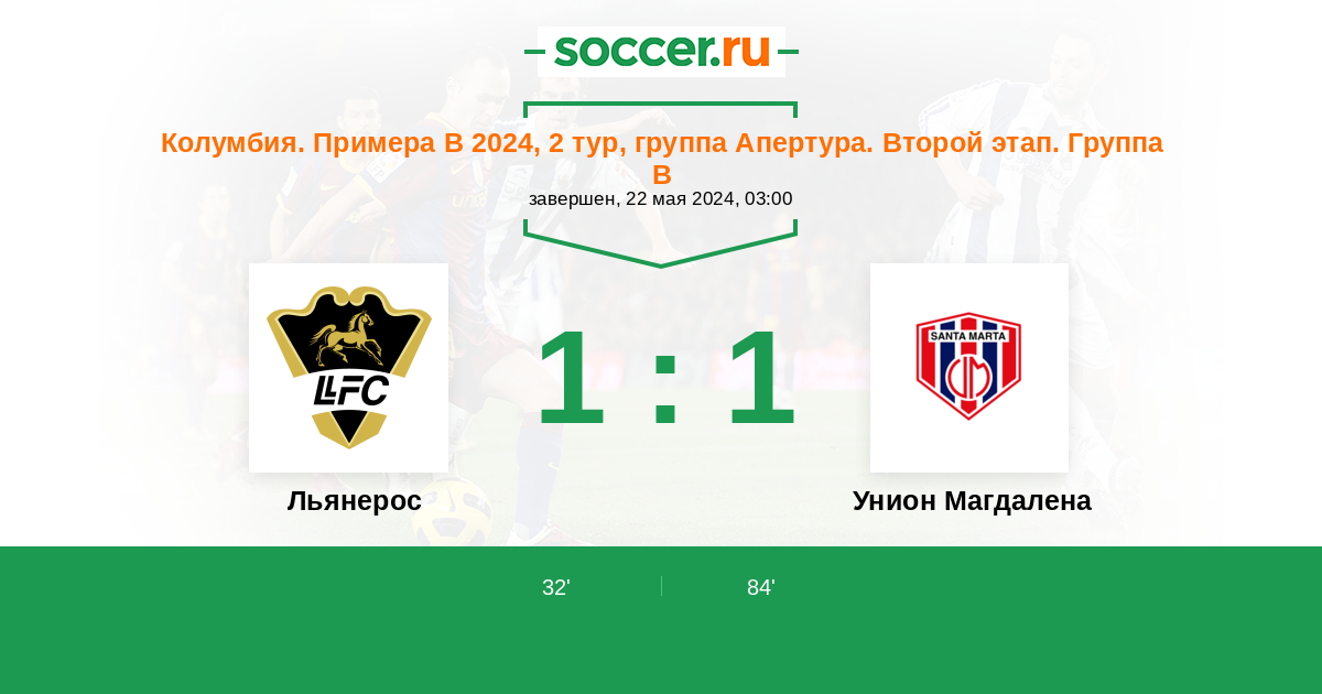 Колумбия. Примера B 24.04.2016 Льянерос Логотип футбольный клуб Льянерос (Вильявисенсио) 1:1 Логотип футбольный клуб Унион Магдалена (Санта Марта) Унион Магдалена