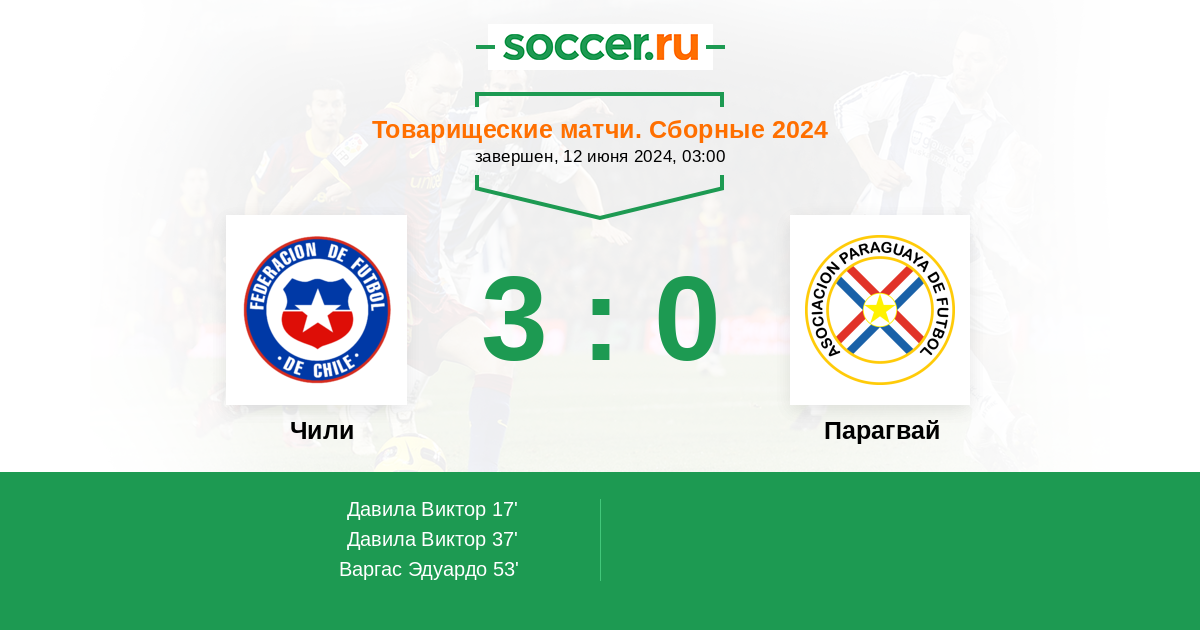 Отбор ЧМ. Южная Америка 01.09.2017 Чили Логотип Чили 0:3 Логотип Парагвай Парагвай