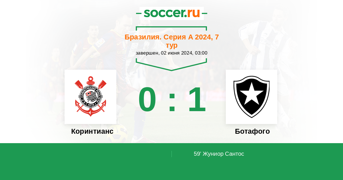 Бразилия. Серия А 15.09.2024 Ботафого Логотип футбольный клуб Ботафого (Рио-де-Жанейро) 2:1 Логотип футбольный клуб Коринтианс (Сан-Паулу) Коринтианс