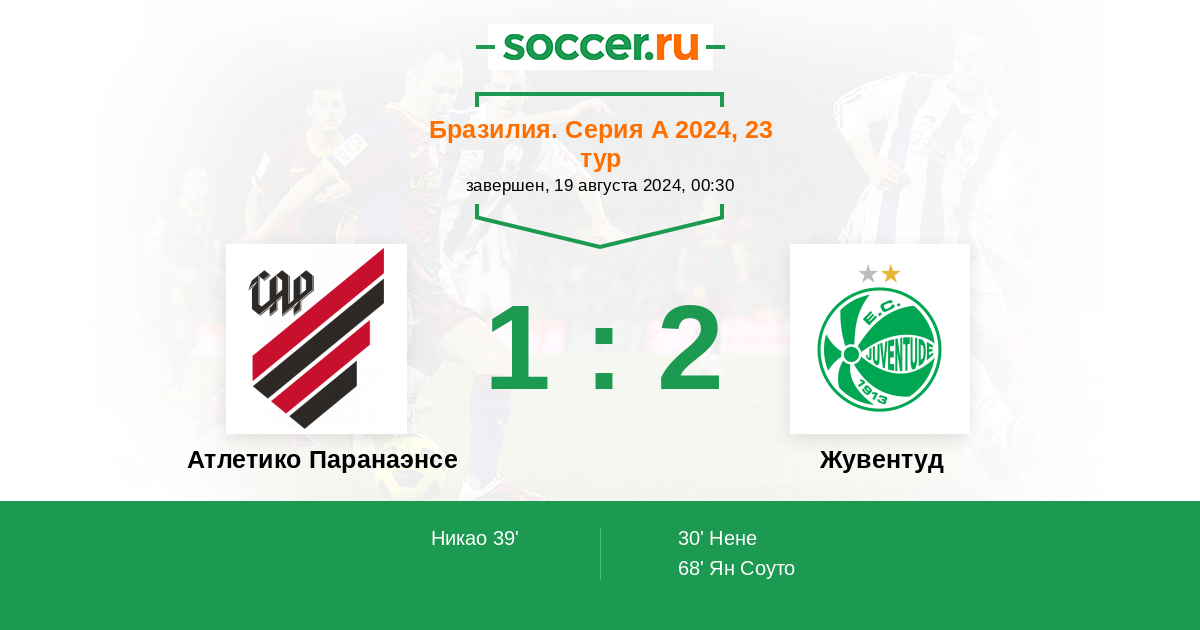 Бразилия. Серия А 29.04.2024 Жувентуд Логотип футбольный клуб Жувентуд (Кашиас-ду-Сул) 1:1 Логотип футбольный клуб Атлетико Паранаэнсе (Куритиба) Атлетико Паранаэнсе