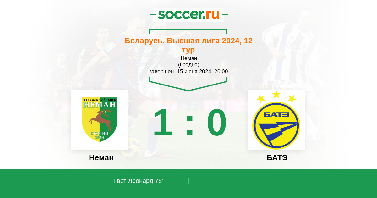 Беларусь. Высшая лига 12.06.2021 БАТЭ Логотип футбольный клуб БАТЭ (Борисов) 3:0 Логотип футбольный клуб Неман (Гродно) Неман