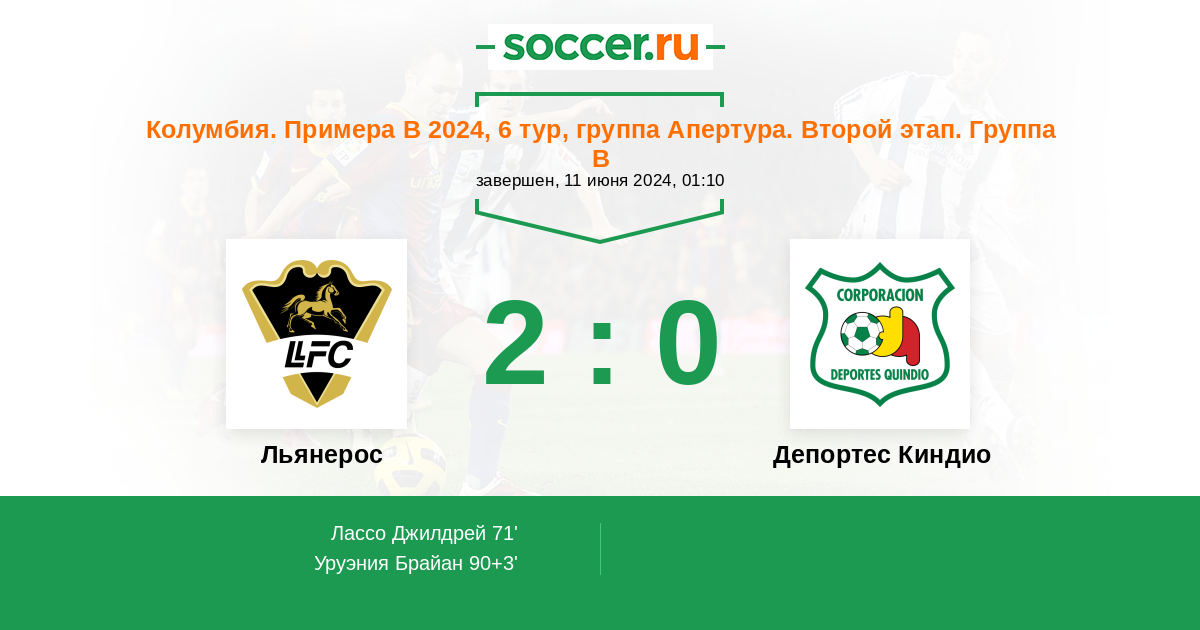 Колумбия. Примера B 12.06.2023 Льянерос Логотип футбольный клуб Льянерос (Вильявисенсио) 2:0 Логотип футбольный клуб Депортес Киндио (Армения) Депортес Киндио