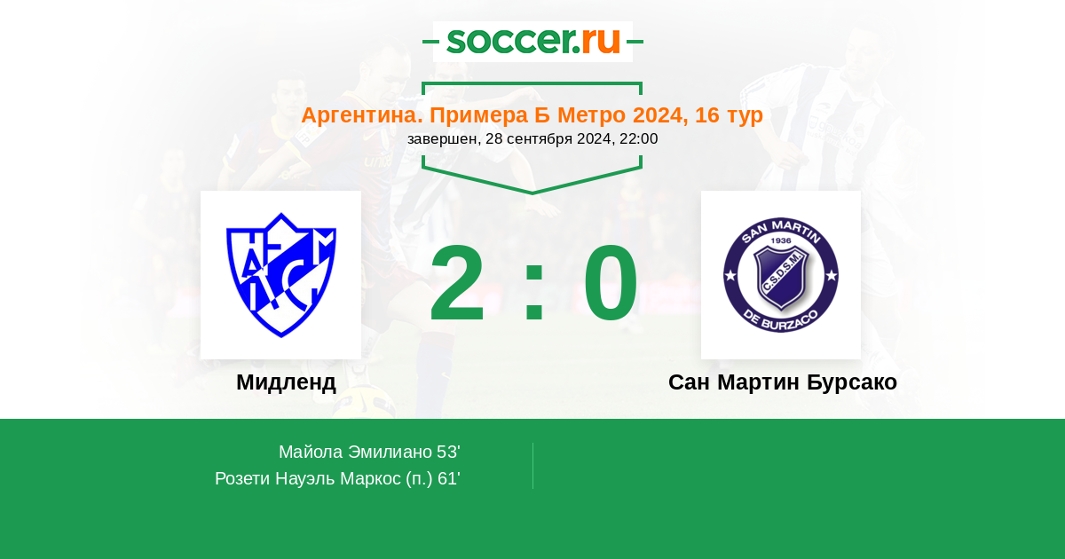 Аргентина. Примера Б Метро 30.09.2025 Сан Мартин Бурсако Логотип футбольный клуб Сан Мартин Бурсако 1:0 Логотип футбольный клуб Мидленд (Либертад) Мидленд