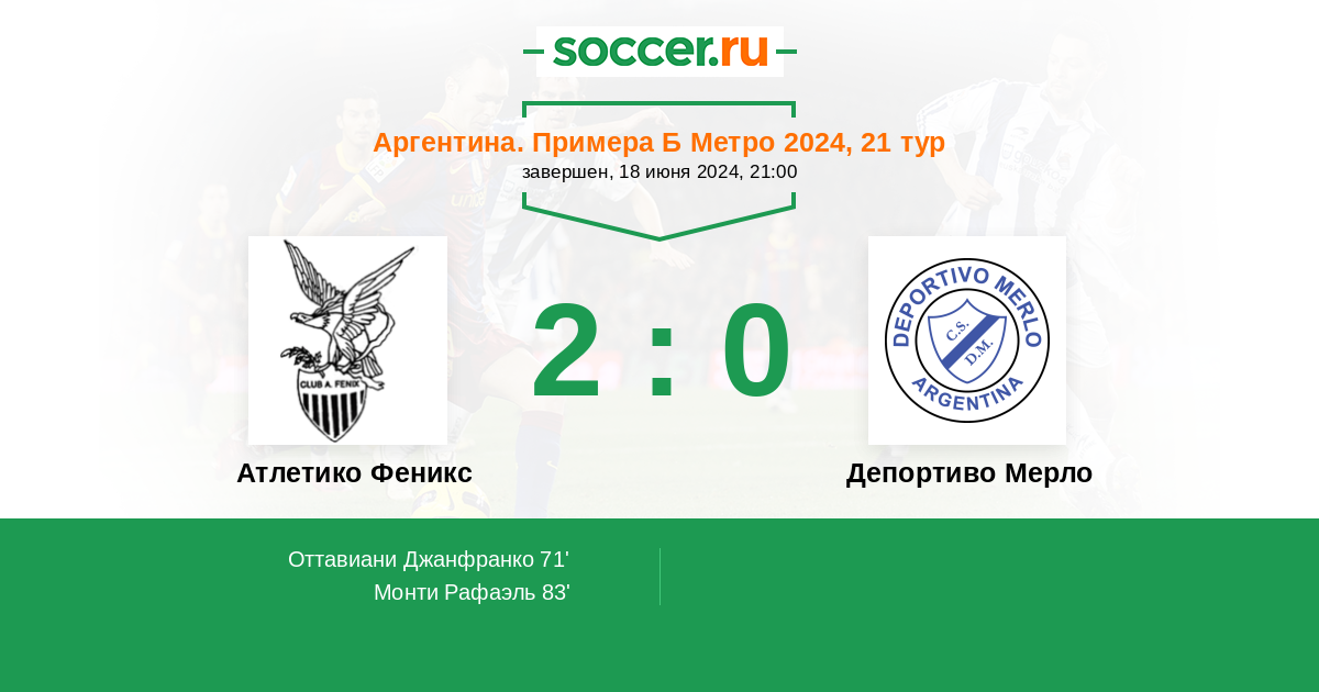 Аргентина. Примера Б Метро 19.07.2025 Депортиво Мерло Логотип футбольный клуб Депортиво Мерло 0:1 Логотип футбольный клуб Атлетико Феникс (Пилар) Атлетико Феникс