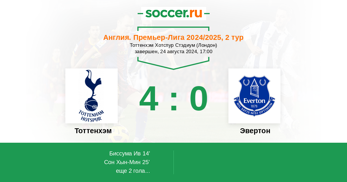 Англия. Премьер-Лига 26.10.2025 Эвертон Логотип футбольный клуб Эвертон (Ливерпуль) 0:3 Логотип футбольный клуб Тоттенхэм (Лондон) Тоттенхэм