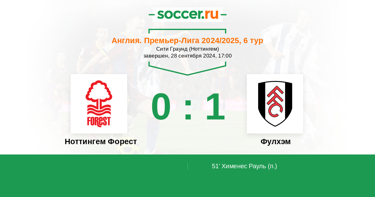 Англия. Премьер-Лига 22.12.2025 Фулхэм Логотип футбольный клуб Фулхэм (Лондон) 1:0 Логотип футбольный клуб Ноттингем Форест Ноттингем Форест