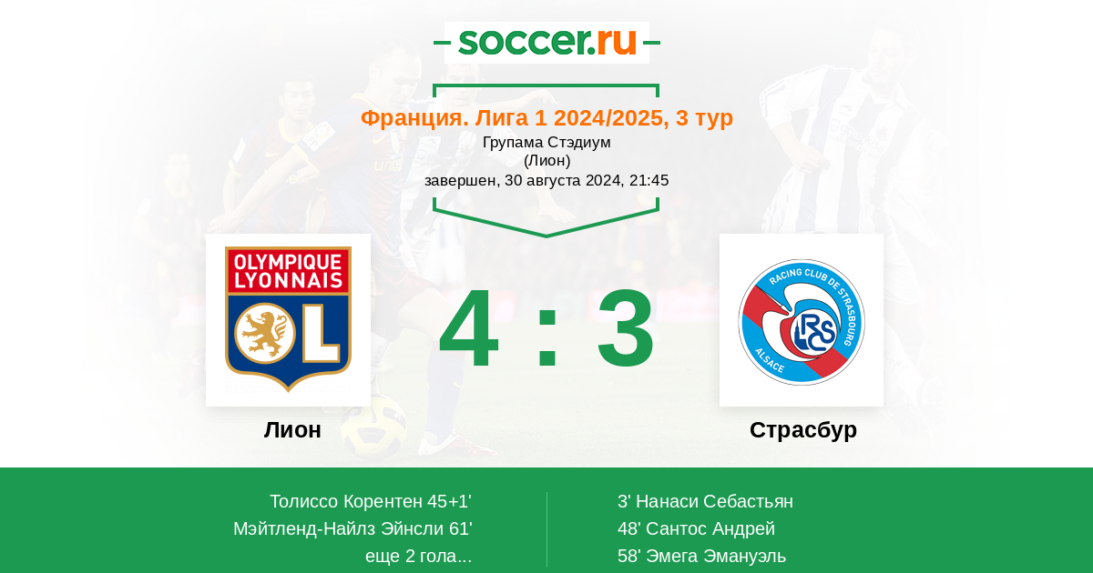 Франция. Лига 1 28.03.2025 Страсбур Логотип футбольный клуб Страсбур 4:2 Логотип футбольный клуб Лион Лион