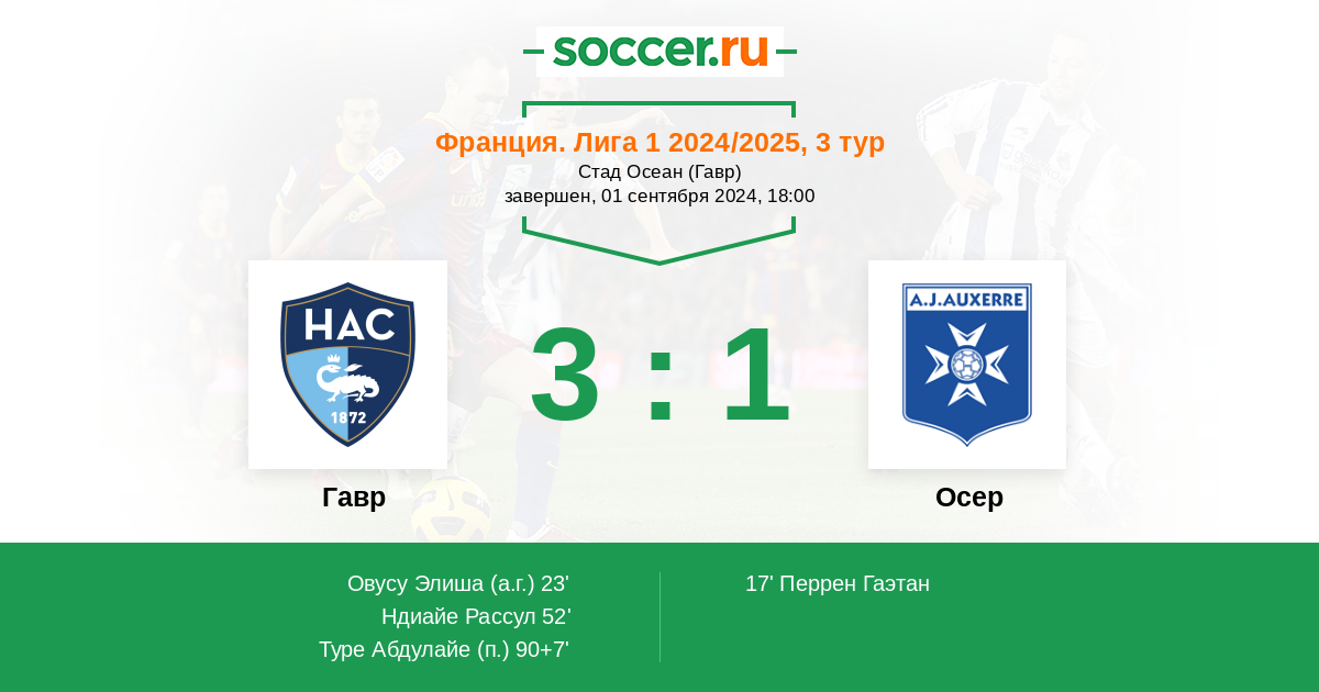 Франция. Лига 1 04.05.2025 Осер Логотип футбольный клуб Осер 1:2 Логотип футбольный клуб Гавр Гавр