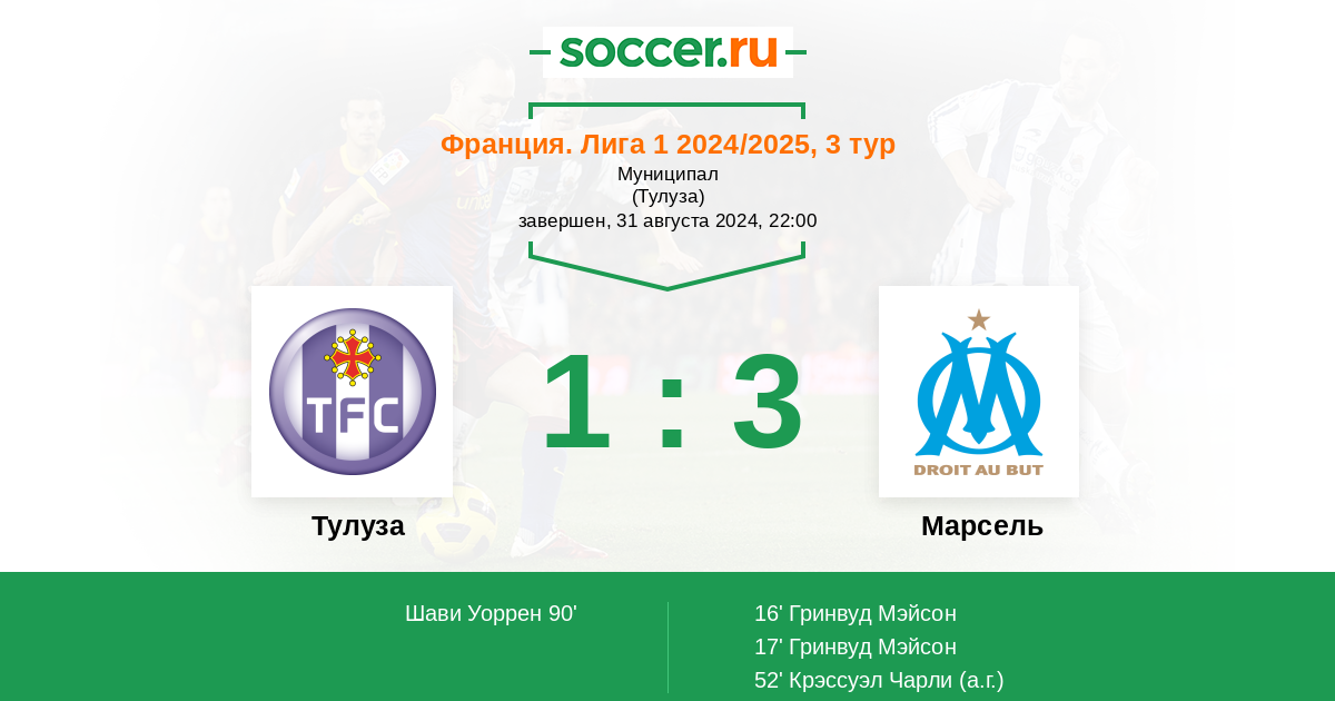 Франция. Лига 1 06.04.2025 Марсель Логотип футбольный клуб Марсель 3:2 Логотип футбольный клуб Тулуза Тулуза