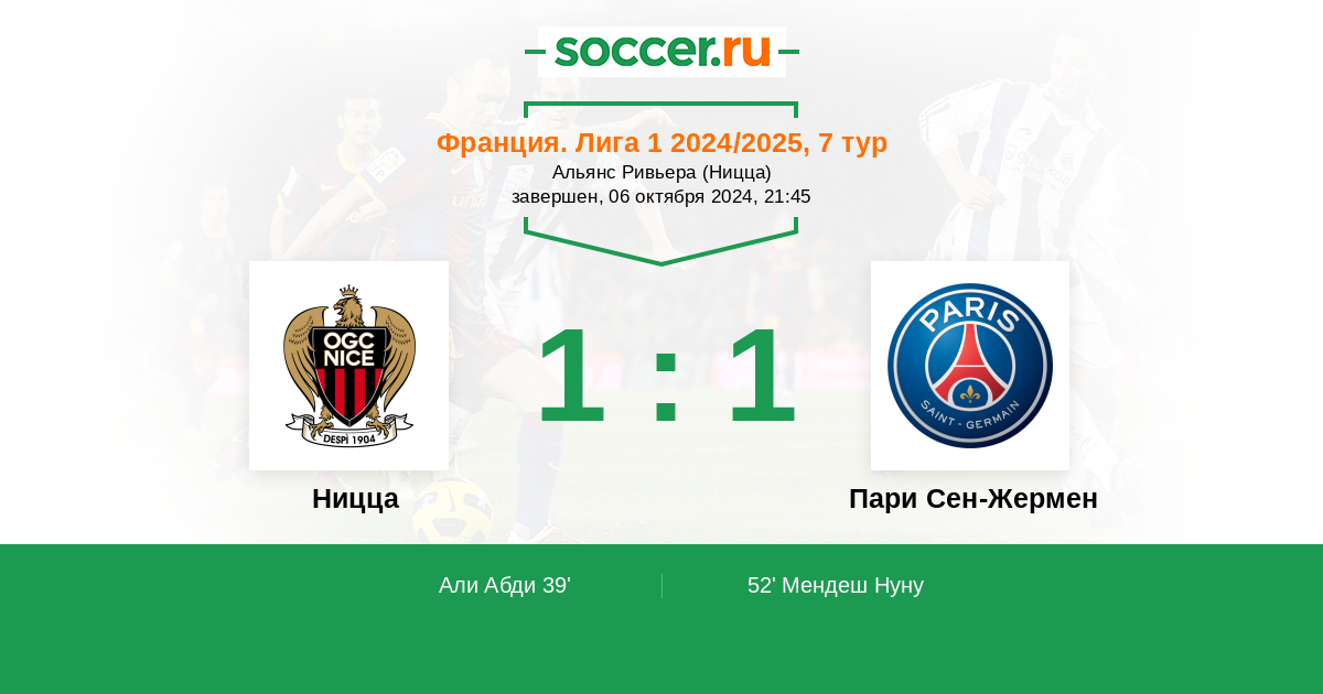 Франция. Лига 1 20.09.2020 Ницца Логотип футбольный клуб Ницца 0:3 Логотип футбольный клуб Пари Сен-Жермен (Париж) Пари Сен-Жермен