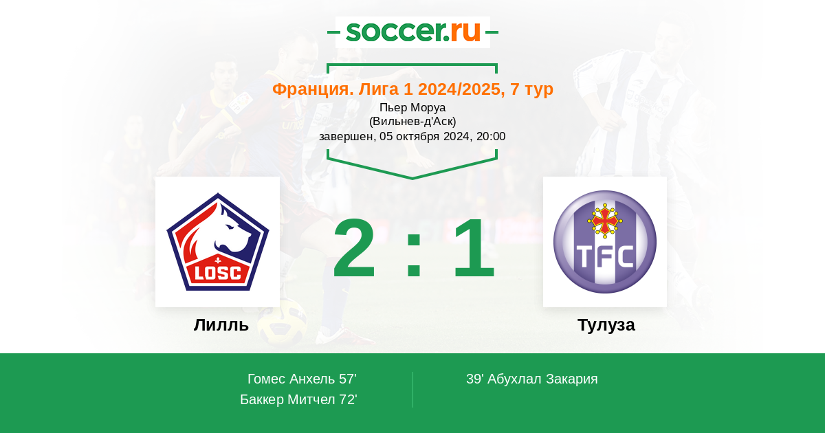 Франция. Лига 1 14.09.2025 Лилль Логотип футбольный клуб Лилль 2:1 Логотип футбольный клуб Тулуза Тулуза