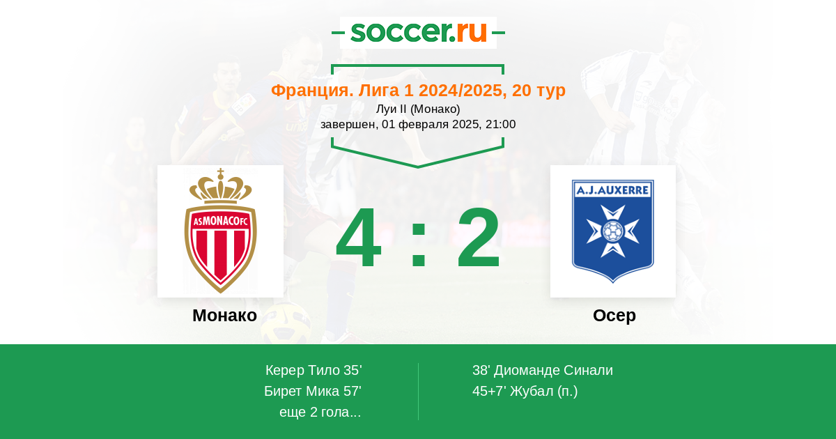 Франция. Лига 1 14.09.2024 Осер Логотип футбольный клуб Осер 0:3 Логотип футбольный клуб Монако Монако
