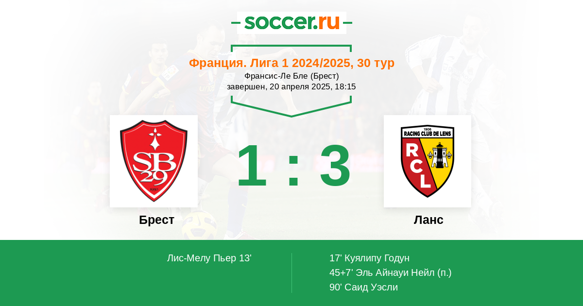 Франция. Лига 1 18.04.2021 Брест Логотип футбольный клуб Брест 1:1 Логотип футбольный клуб Ланс Ланс