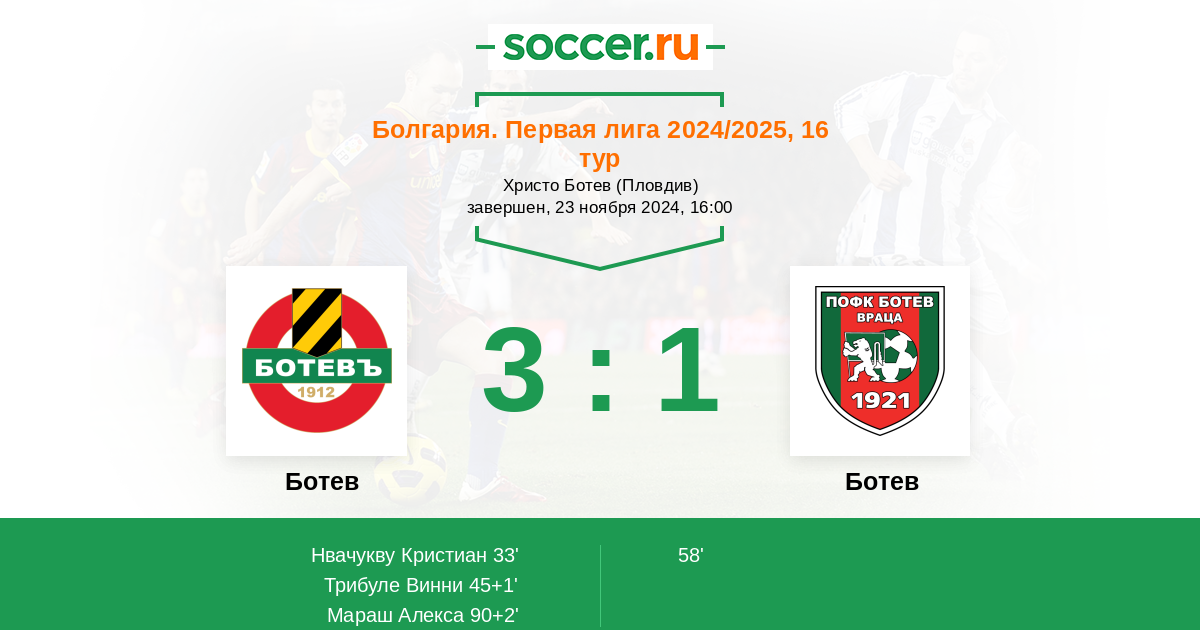 Болгария. Первая лига 12.04.2024 Ботев Логотип футбольный клуб Ботев (Пловдив) 2:0 Логотип футбольный клуб Ботев (Враца) Ботев