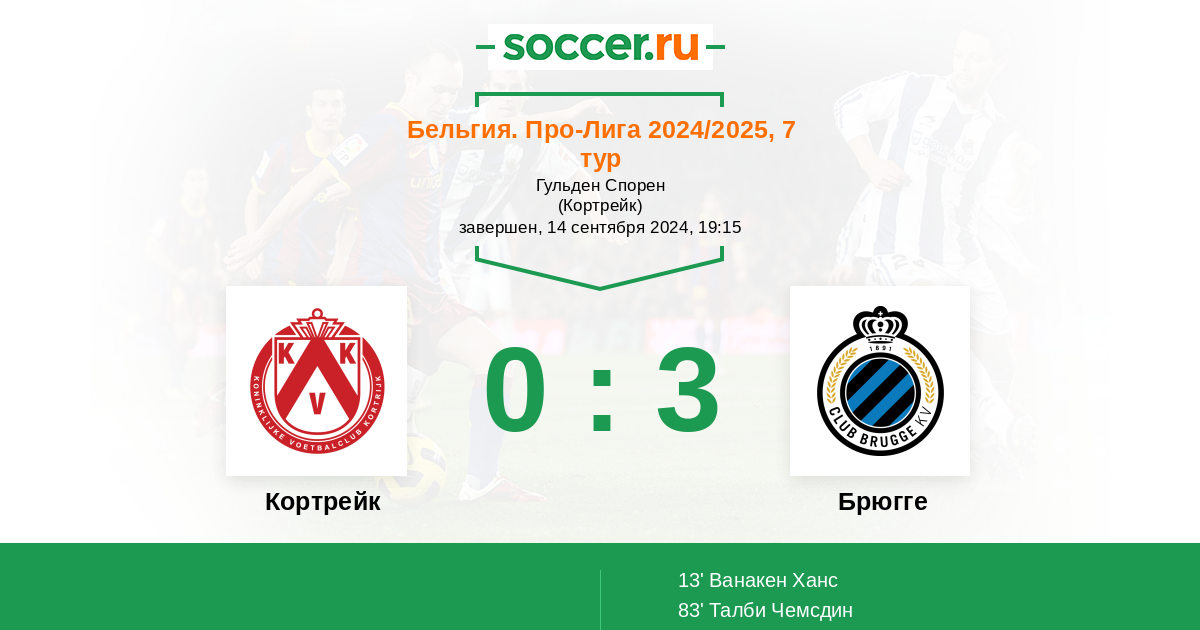 Бельгия. Про-Лига 21.09.2014 Брюгге Логотип футбольный клуб Брюгге 5:0 Логотип футбольный клуб Кортрейк Кортрейк