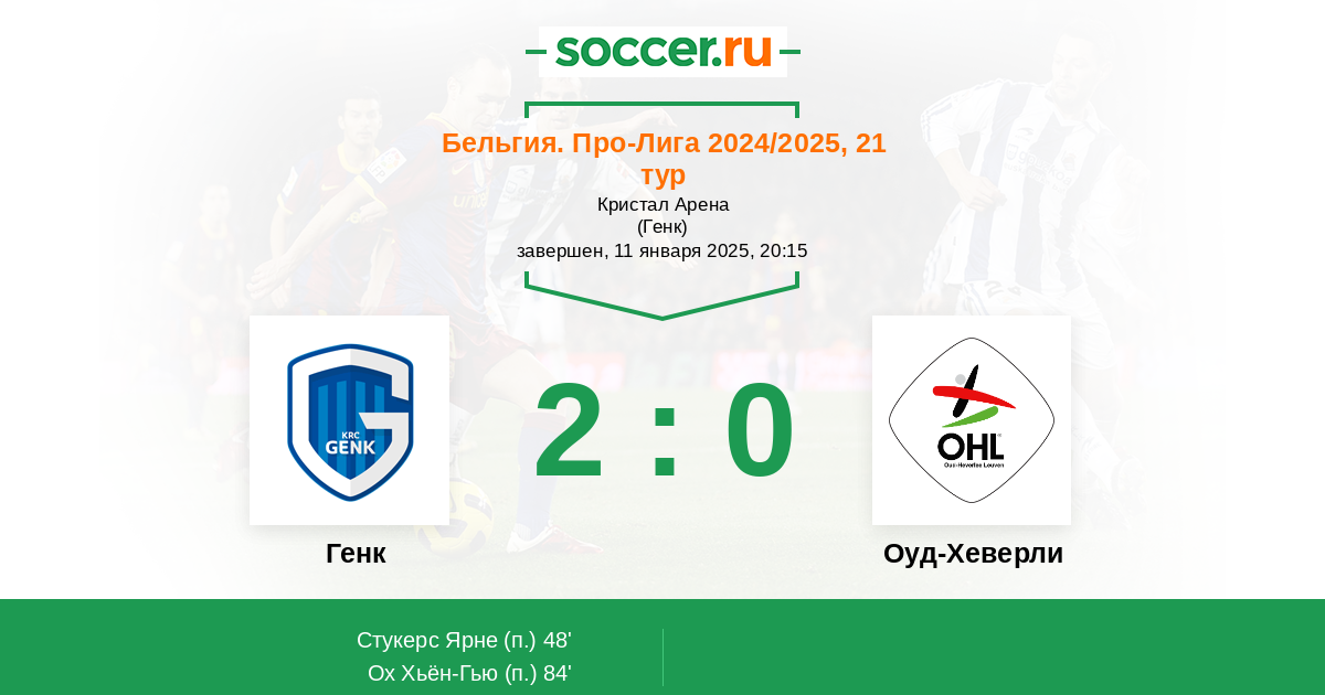 Бельгия. Про-Лига 30.11.2025 Генк Логотип футбольный клуб Генк 2:1 Логотип футбольный клуб Оуд-Хеверли (Левен) Оуд-Хеверли