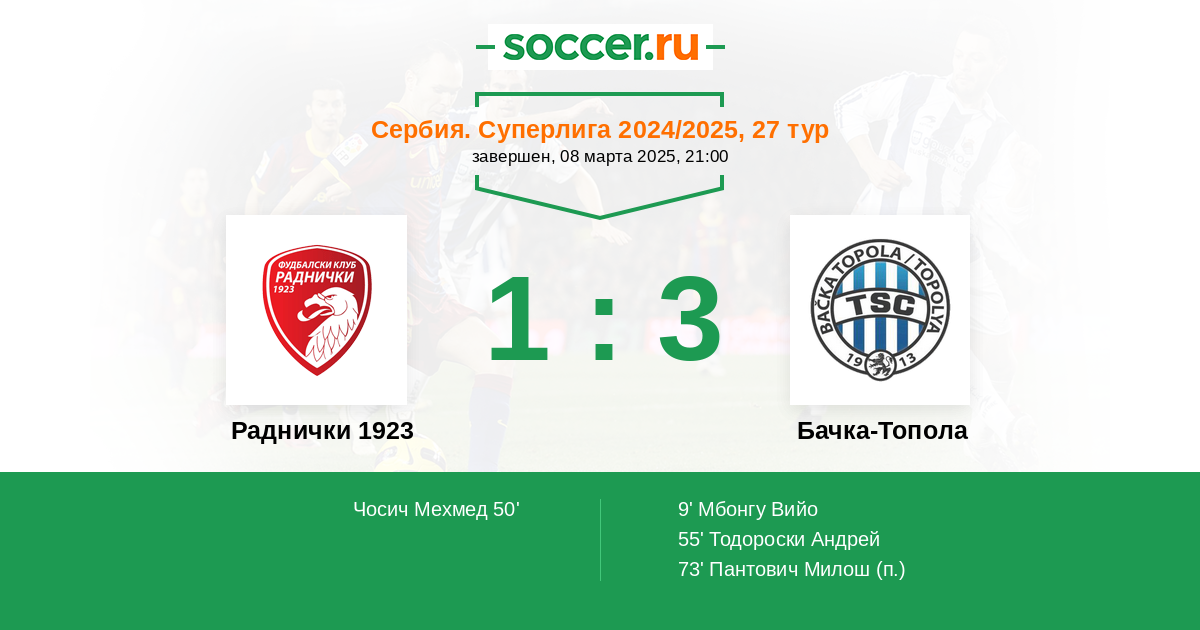 Сербия. Суперлига 08.05.2024 Бачка-Топола Логотип футбольный клуб Бачка-Топола 4:3 Логотип футбольный клуб Раднички 1923 (Крагуевац) Раднички 1923