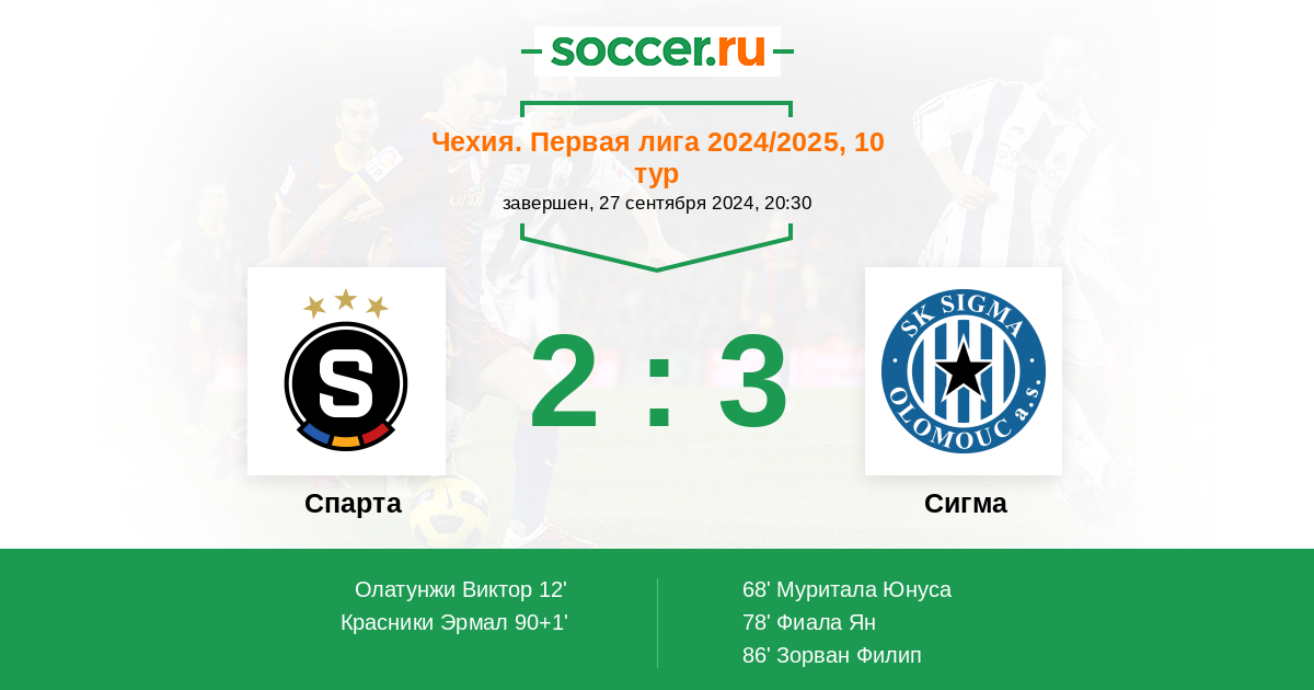 Чехия. Первая Лига 24.09.2012 Спарта Логотип футбольный клуб Спарта (Прага) 1:2 Логотип футбольный клуб Сигма (Оломоуц) Сигма
