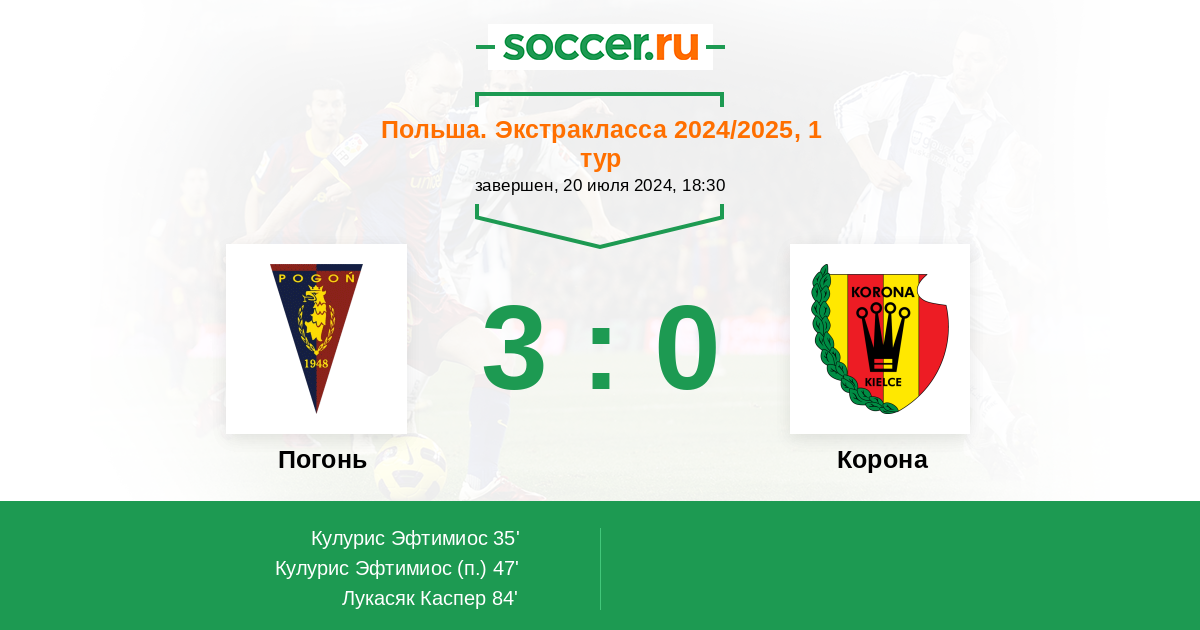 Польша. Экстракласса 13.09.2025 Корона Логотип футбольный клуб Корона (Кельце) 1:0 Логотип футбольный клуб Погонь (Щецин) Погонь
