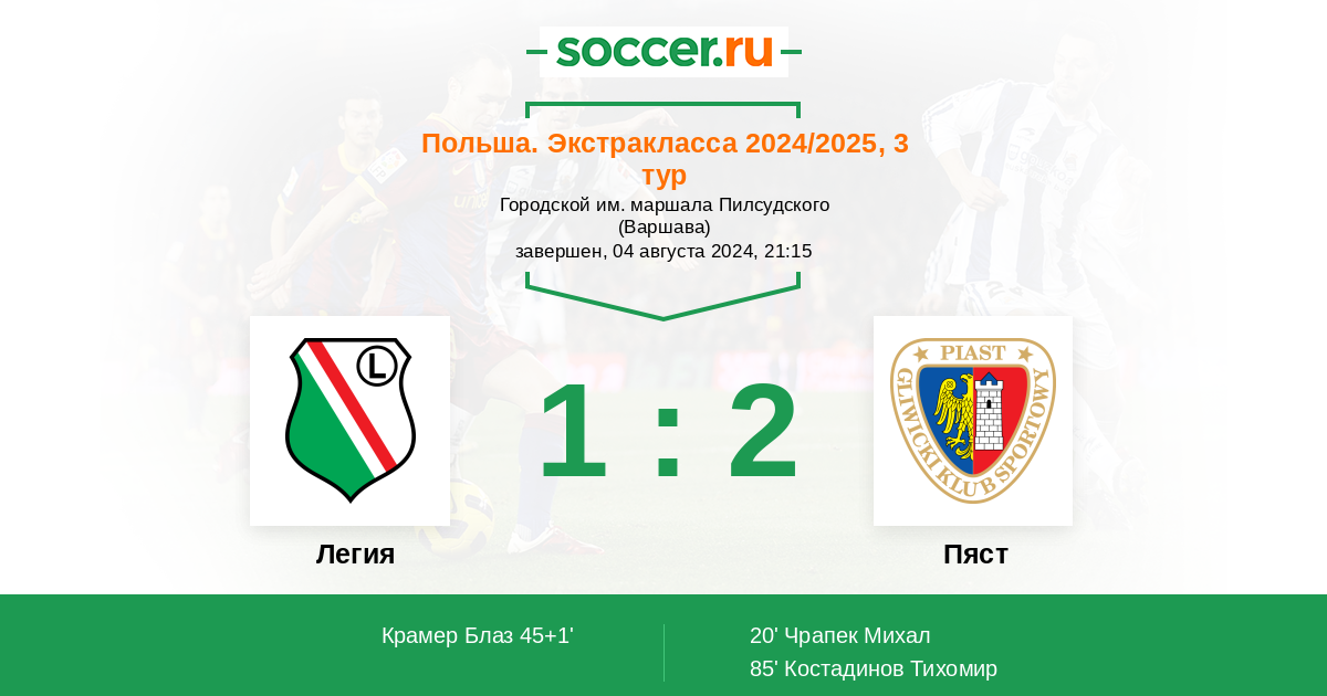 Польша. Экстракласса 05.08.2022 Легия Логотип футбольный клуб Легия (Варшава) 2:0 Логотип футбольный клуб Пяст (Гливице) Пяст