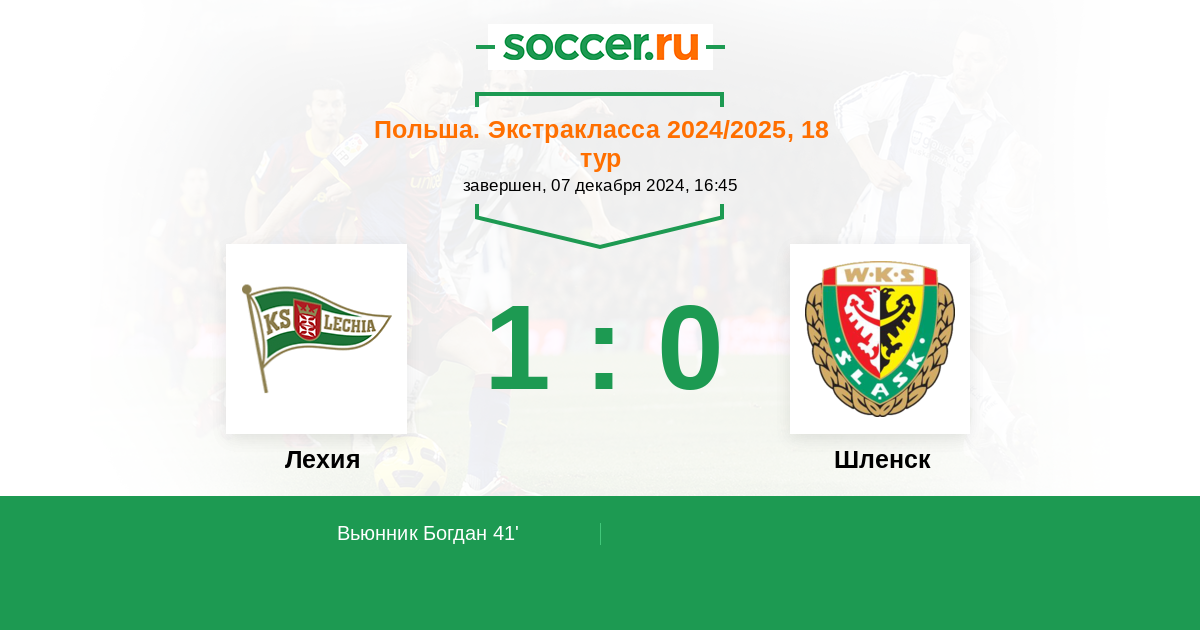Польша. Экстракласса 01.12.2017 Лехия Логотип футбольный клуб Лехия (Гданьск) 3:1 Логотип футбольный клуб Шленск (Вроцлав) Шленск