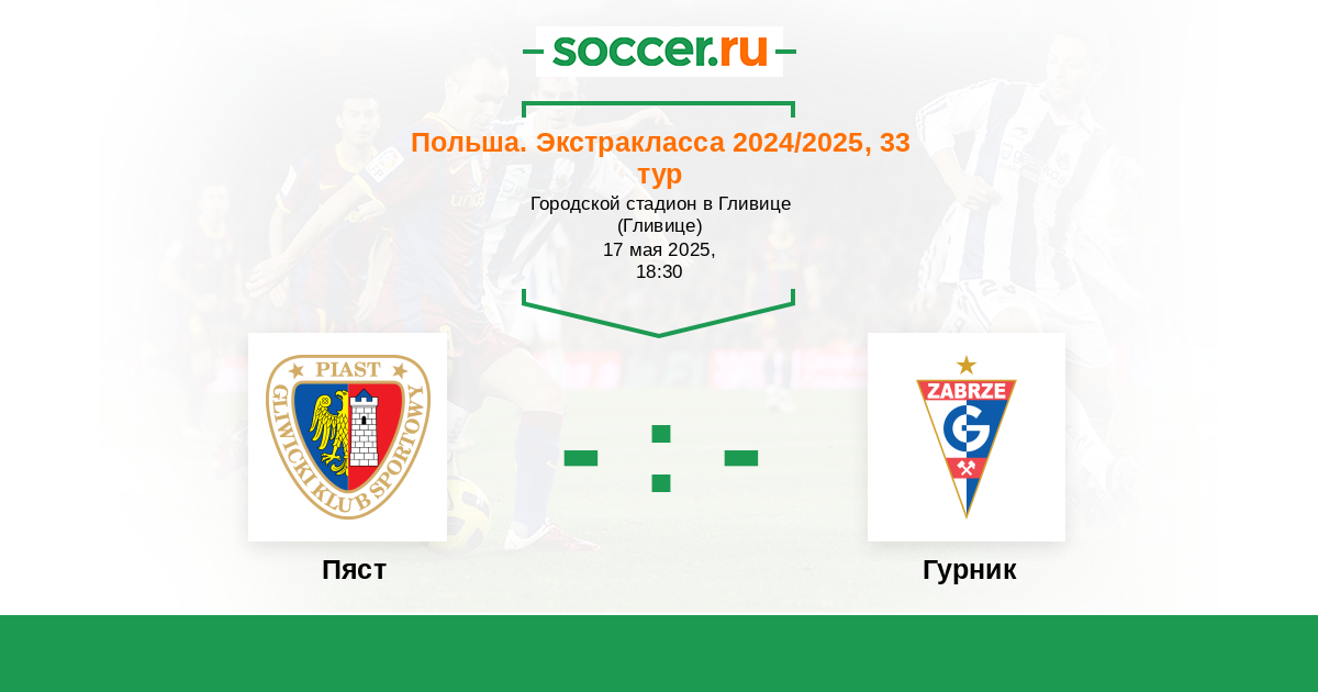 Польша. Экстракласса 24.11.2024 Гурник Логотип футбольный клуб Гурник (Забже) 1:0 Логотип футбольный клуб Пяст (Гливице) Пяст