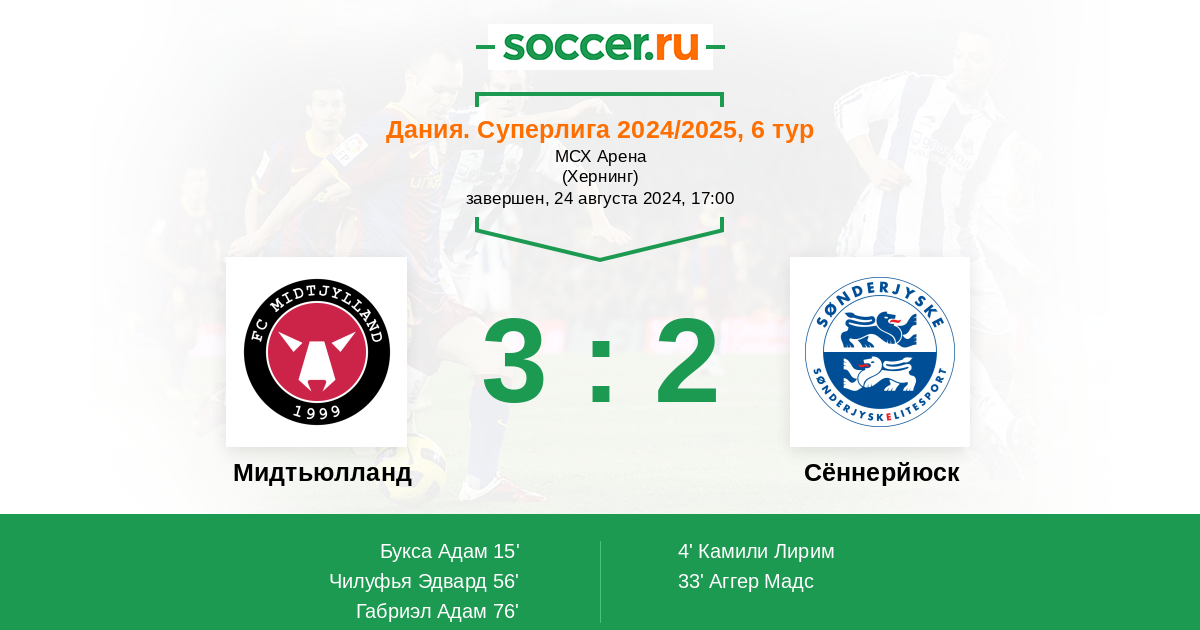 Дания. Суперлига 24.10.2021 Мидтьюлланд Логотип футбольный клуб Мидтьюлланд (Хернинг) 3:2 Логотип футбольный клуб Сённерйюск (Хадерслев) Сённерйюск