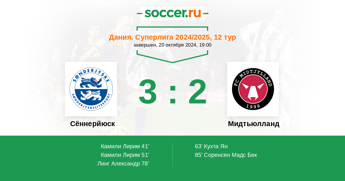 Дания. Суперлига 24.10.2021 Мидтьюлланд Логотип футбольный клуб Мидтьюлланд (Хернинг) 3:2 Логотип футбольный клуб Сённерйюск (Хадерслев) Сённерйюск
