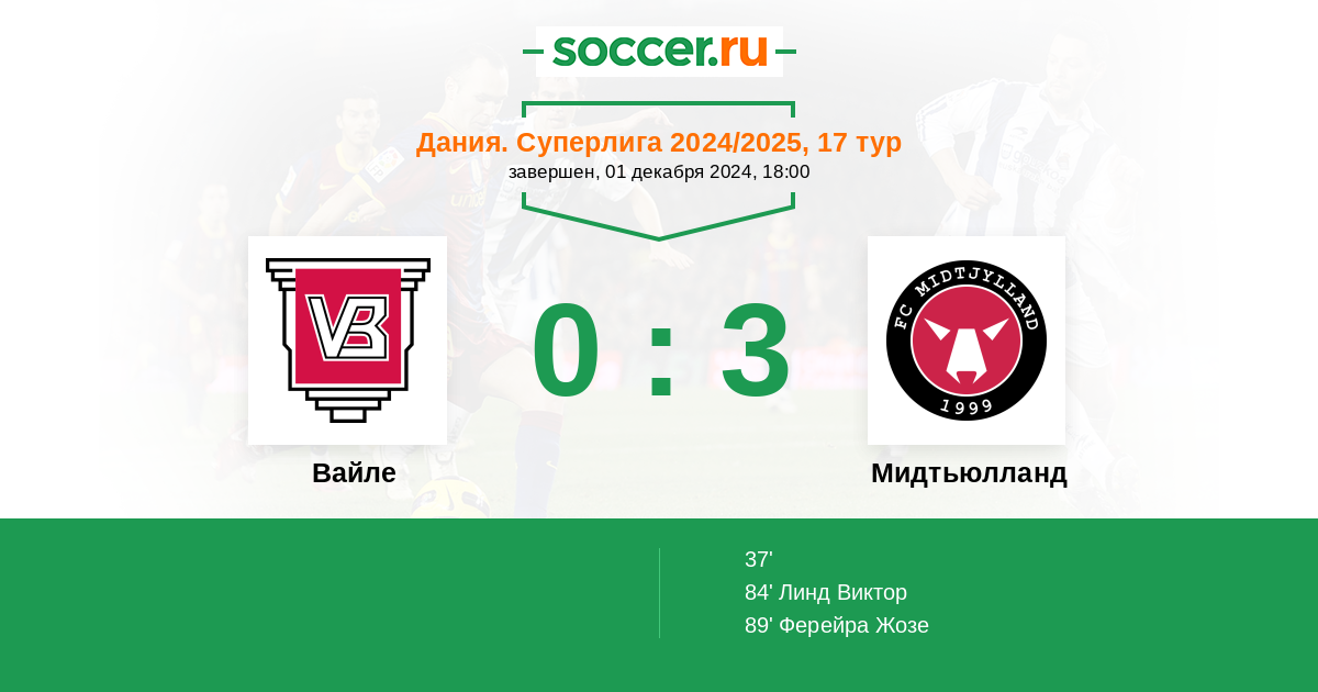 Дания. Суперлига 05.12.2020 Вайле Логотип футбольный клуб Вайле 0:2 Логотип футбольный клуб Мидтьюлланд (Хернинг) Мидтьюлланд