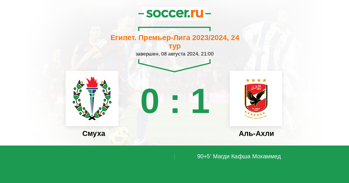 Египет. Премьер-Лига 04.07.2021 Смуха Логотип футбольный клуб Смуха (Александрия) 0:4 Логотип футбольный клуб Аль-Ахли (Каир) Аль-Ахли