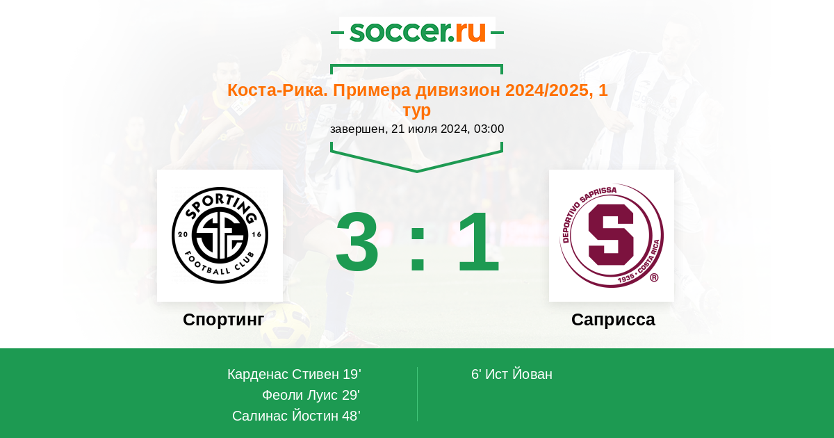 Коста-Рика. Примера дивизион 24.08.2025 Саприсса Логотип футбольный клуб Саприсса (Сан Хосе) 4:0 Логотип футбольный клуб Спортинг Сан-Хосе Спортинг Сан-Хосе