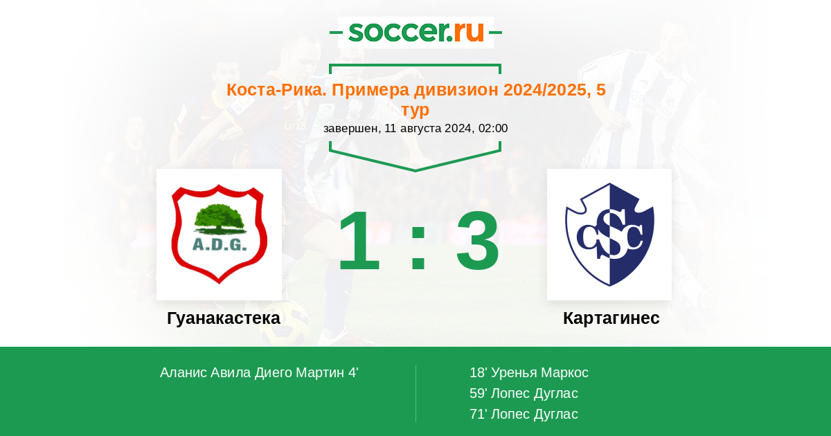 Коста-Рика. Примера дивизион 20.04.2025 Картахинес Логотип футбольный клуб Картахинес (Карфаген) 3:0 Логотип футбольный клуб Гуанакастека (Никойя) Гуанакастека