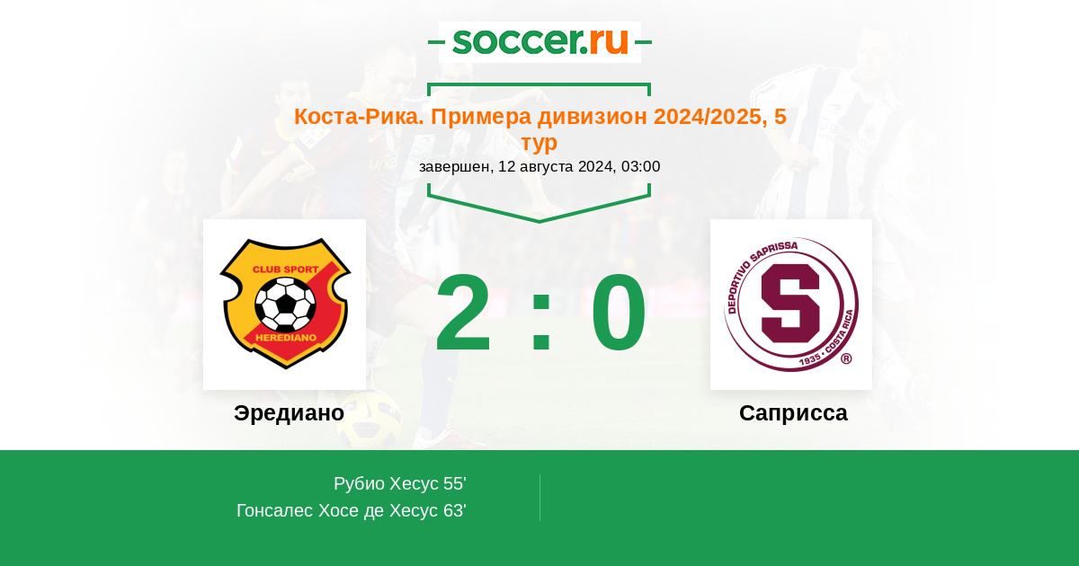 Коста-Рика. Примера дивизион 13.08.2018 Саприсса Логотип футбольный клуб Саприсса (Сан Хосе) 1:0 Логотип футбольный клуб Эредиано Эредиано