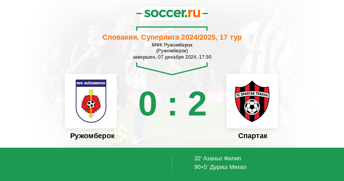 Словакия. Суперлига 17.07.2020 Спартак Логотип футбольный клуб Спартак (Трнава) 0:2 Логотип футбольный клуб Ружомберок Ружомберок