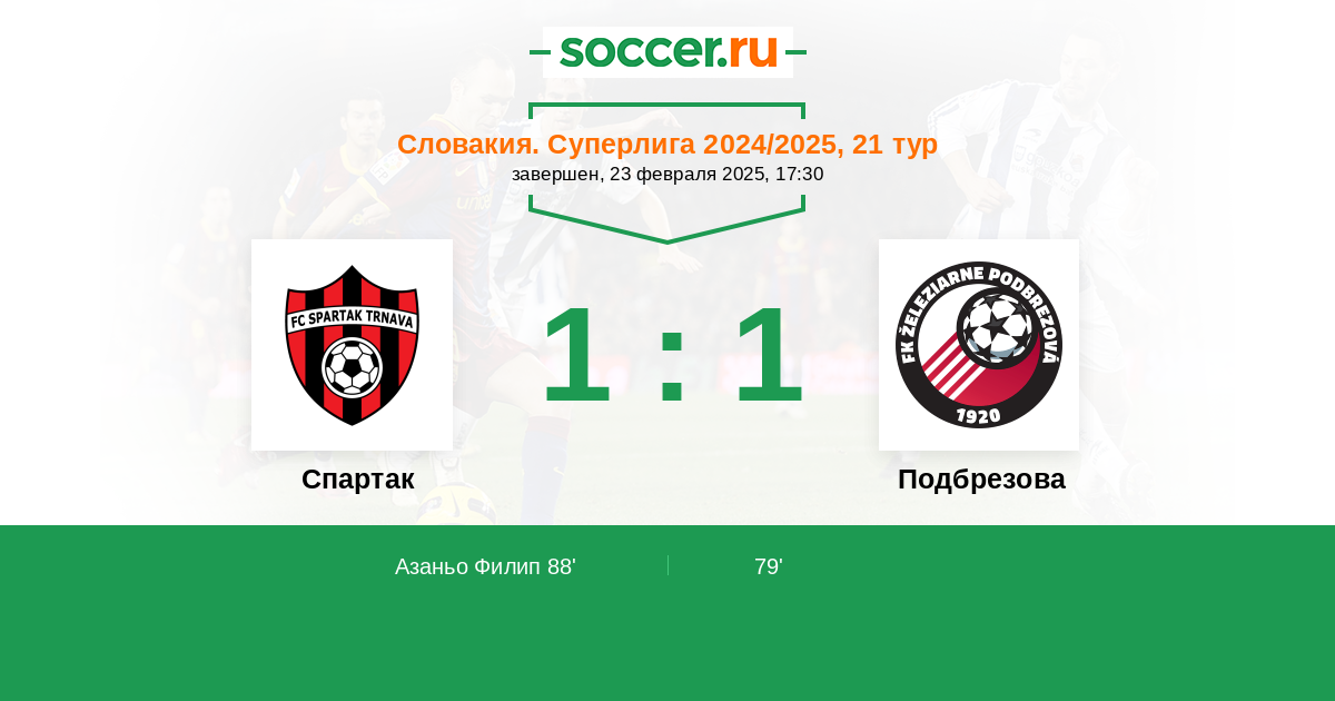 Словакия. Суперлига 28.07.2017 Подбрезова Логотип футбольный клуб Подбрезова 1:2 Логотип футбольный клуб Спартак (Трнава) Спартак