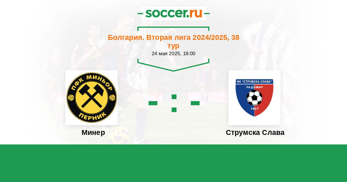 Болгария. Вторая лига 01.05.2023 Минер Логотип футбольный клуб Минер (Перник) 1:1 Логотип футбольный клуб Струмска Слава (Радомир) Струмска Слава
