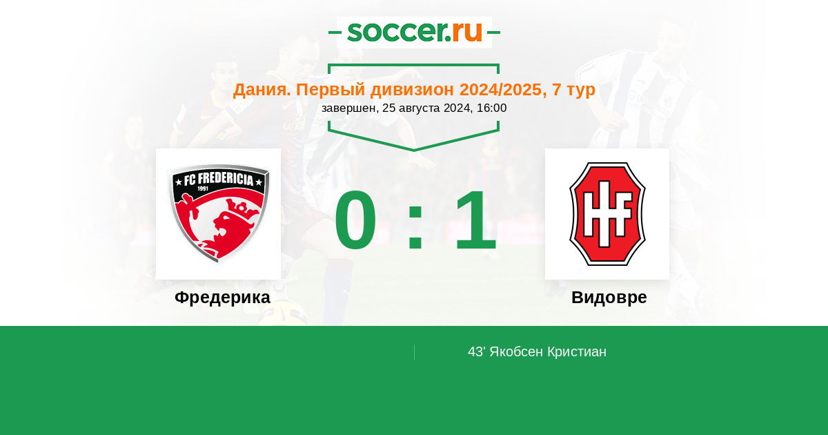 Дания. Первый дивизион 12.08.2018 Фредерика Логотип футбольный клуб Фредерика 0:0 Логотип футбольный клуб Видовре Видовре