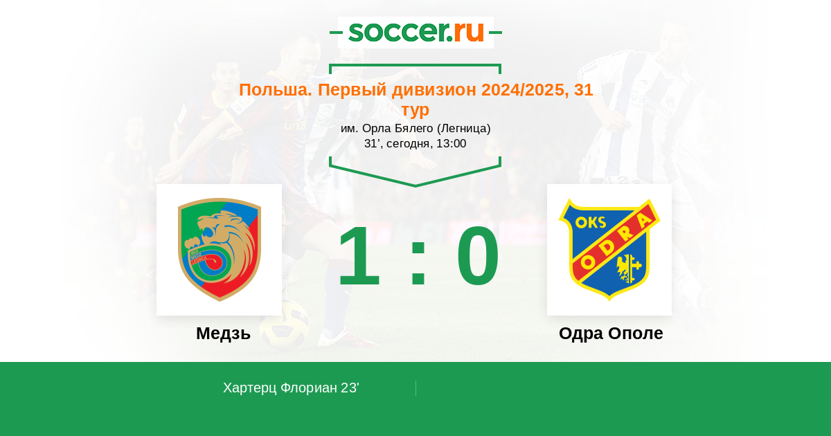 Польша. Первый дивизион 22.09.2023 Медзь Логотип футбольный клуб Медзь (Легница) 1:2 Логотип футбольный клуб Одра Ополе Одра Ополе