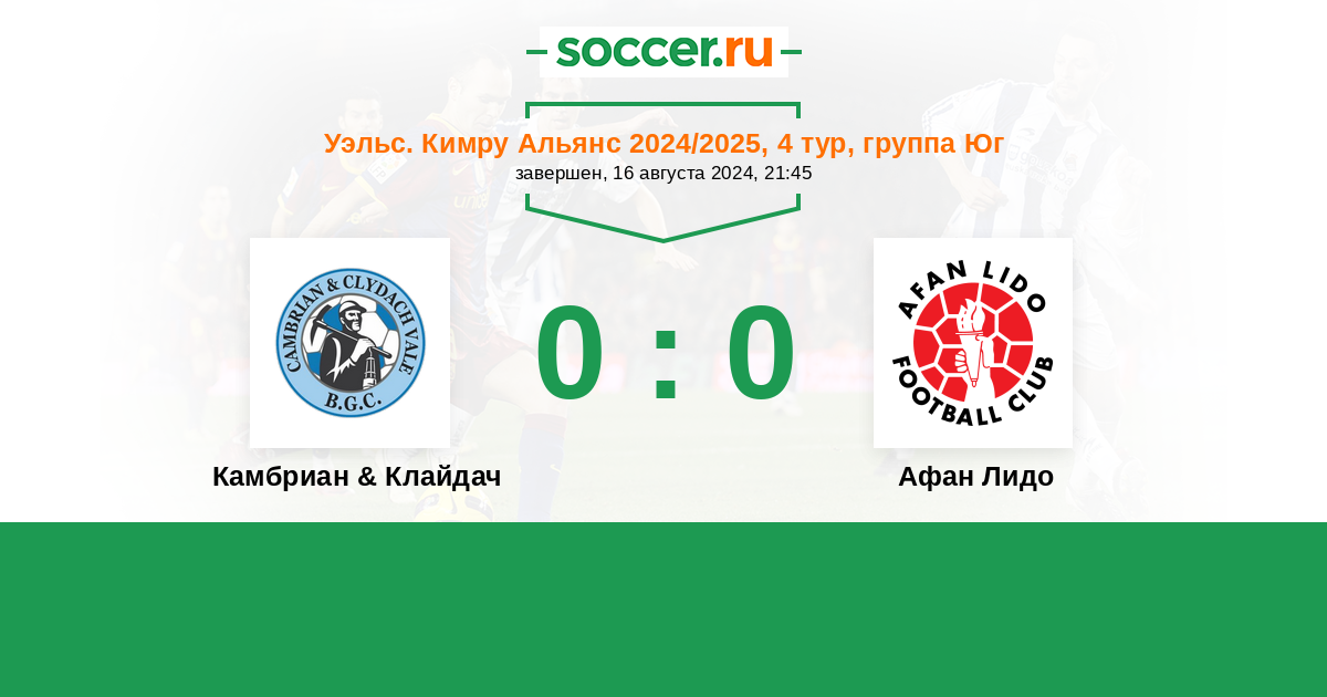 Уэльс. Кимру Альянс 13.08.2016 Афан Лидо Логотип футбольный клуб Афан Лидо (Порт-Толбот) 0:1 Логотип футбольный клуб Камбриан & Клайдач (Клайдач Вейл) Камбриан & Клайдач